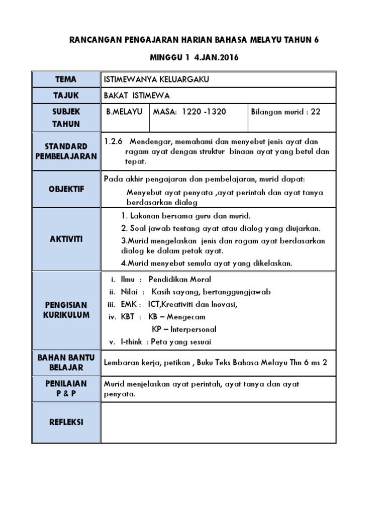 Rph Bahasa Melayu Tahun 6 Kssr Pendidik2u