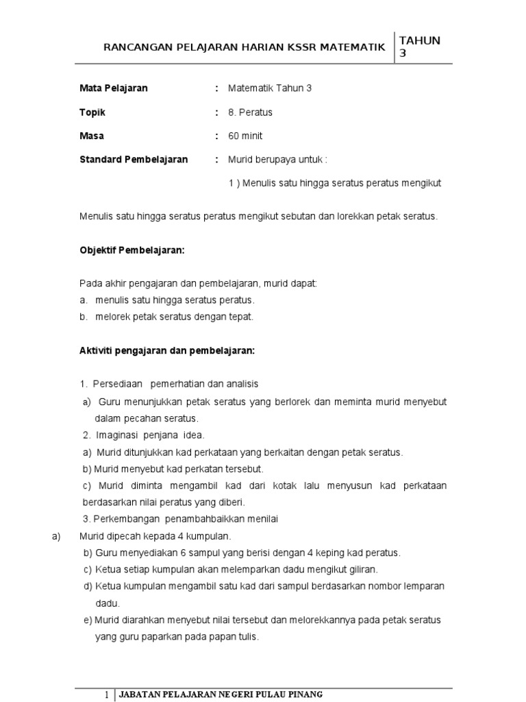 Contoh Rph Matematik Tahun 3 Kssr Semakan
