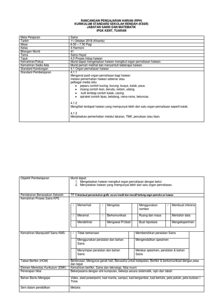 Rancangan Pengajaran Harian Rph Sains Tahun 4