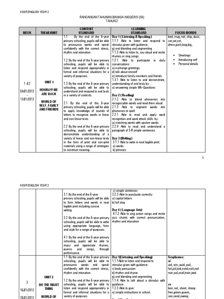 Rancangan Tahunan B Inggeris Tahun 2 Kssr Yearly Scheme Of Work English Year 2 Kssr Stress Linguistics Word