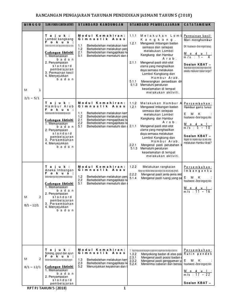 Download Rpt Pendidikan Jasmani Tahun 5 Berguna Rpt Pj Thn 1 2018 Skoloh